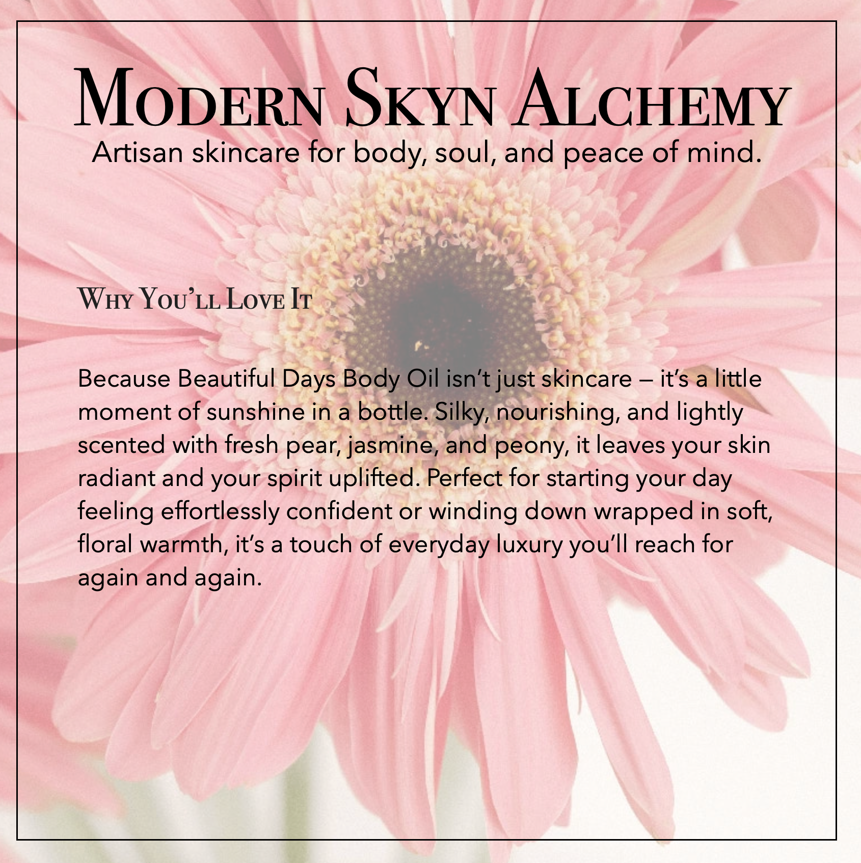 Bask in the gentle radiance of Beautiful Days Body Oil — a handcrafted blend designed to capture the feeling of sunlight, soft florals, and pure serenity. Luxurious yet effortless, this silken oil glides over the skin, leaving it deeply nourished, luminous, and delicately perfumed.