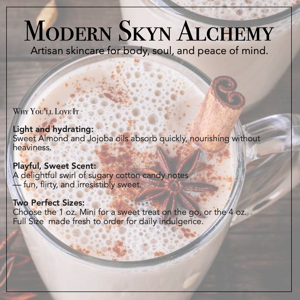 Nourish your skin and senses with our Chai Tea Body Oil — a rich blend of Prunus Amygdalus Dulcis (Sweet Almond) Oil, Simmondsia Chinensis (Jojoba) Seed Oil, and natural fragrance that deeply hydrates while enveloping you in the warm, spicy aroma of cinnamon, clove, and sweet vanilla. Perfect for those who crave a soothing, spicy scent that lingers all day.