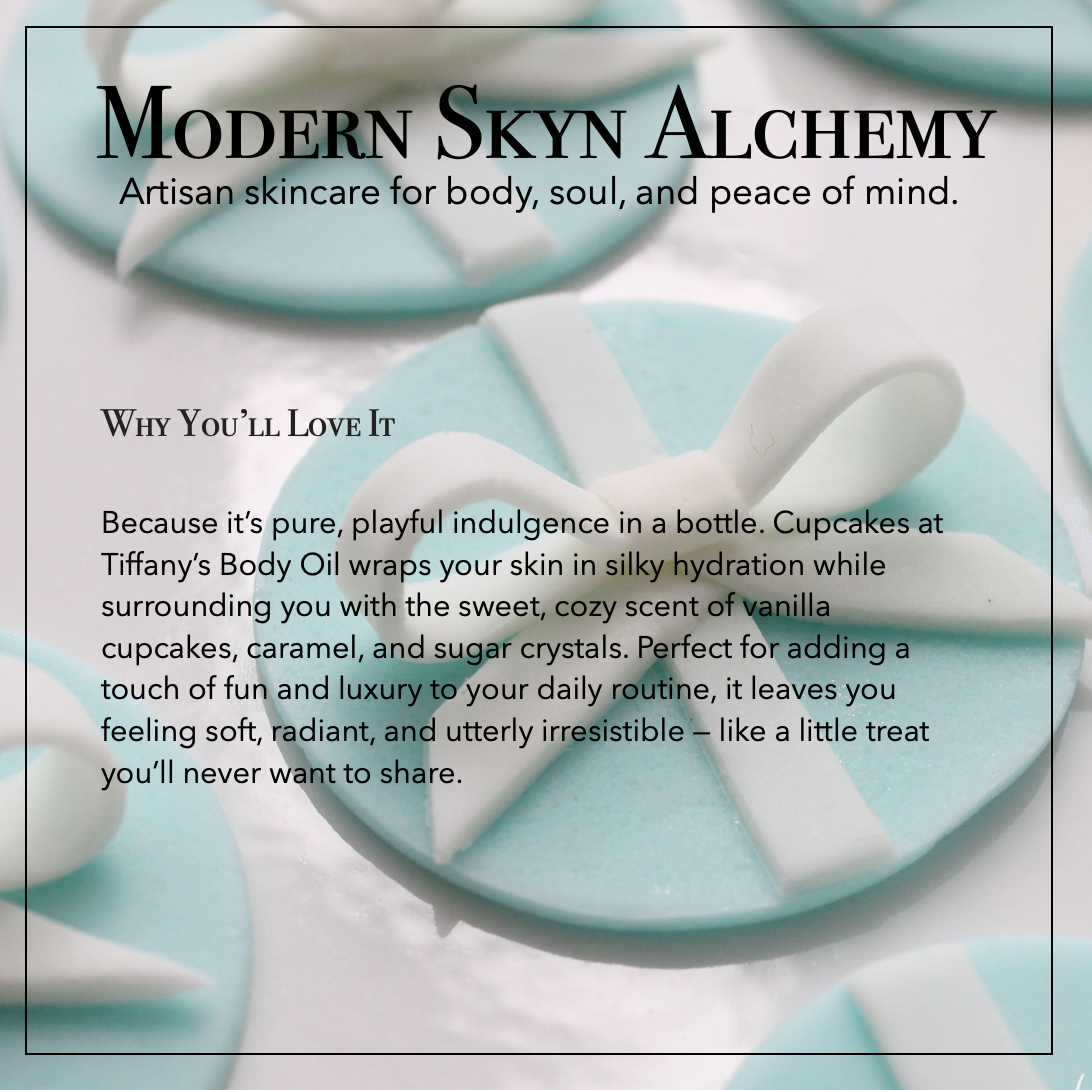 Charming, playful, and irresistibly sweet — Cupcakes at Tiffany’s Body Oil is where sophistication meets pure indulgence. Handcrafted in small batches, this luscious body oil nourishes the skin while surrounding you in the mouthwatering scent of fresh-baked cupcakes and creamy vanilla, all kissed with a hint of elegant caramel and sugar crystals.