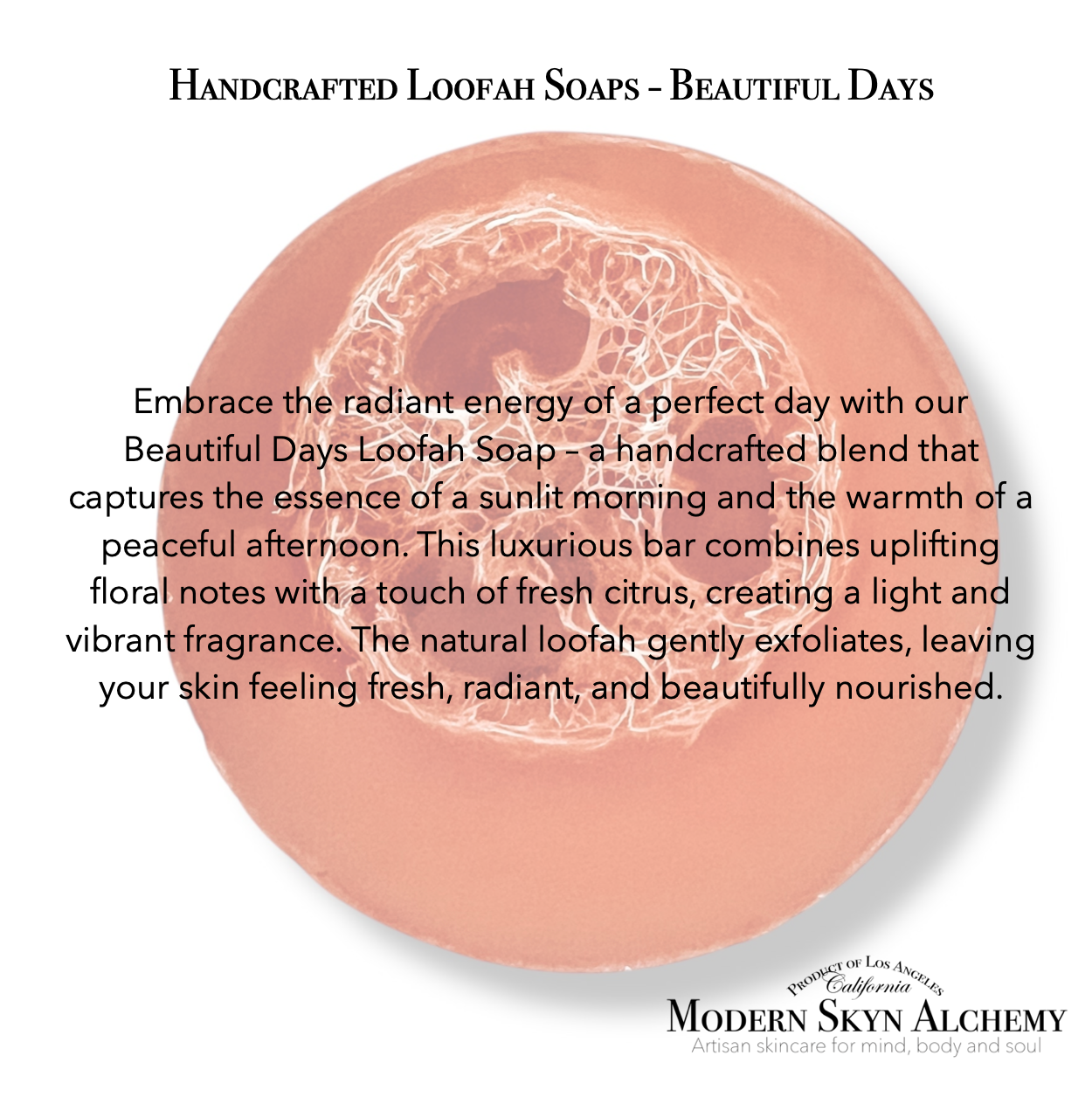 Embrace the radiant energy of a perfect day with our Beautiful Days Loofah Soap – a handcrafted blend that captures the essence of a sunlit morning and the warmth of a peaceful afternoon. This luxurious bar combines uplifting floral notes with a touch of fresh citrus, creating a light and vibrant fragrance. The natural loofah gently exfoliates, leaving your skin feeling fresh, radiant, and beautifully nourished.