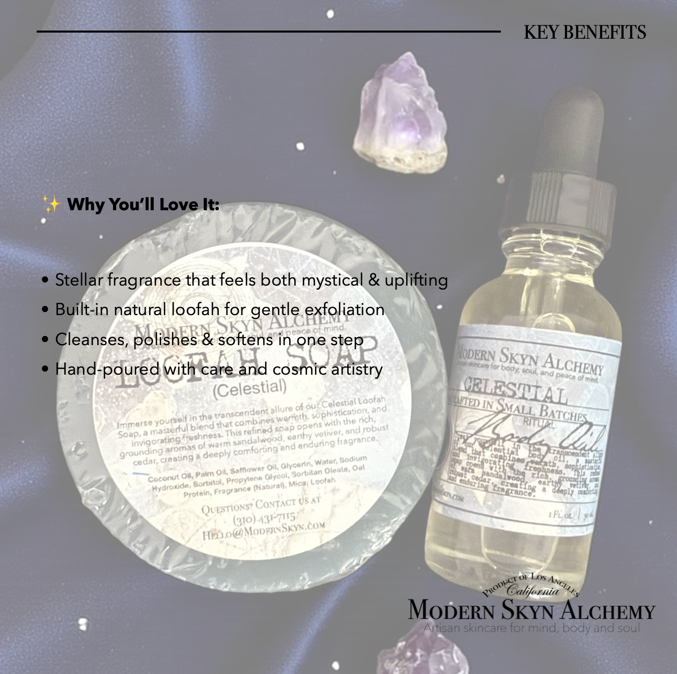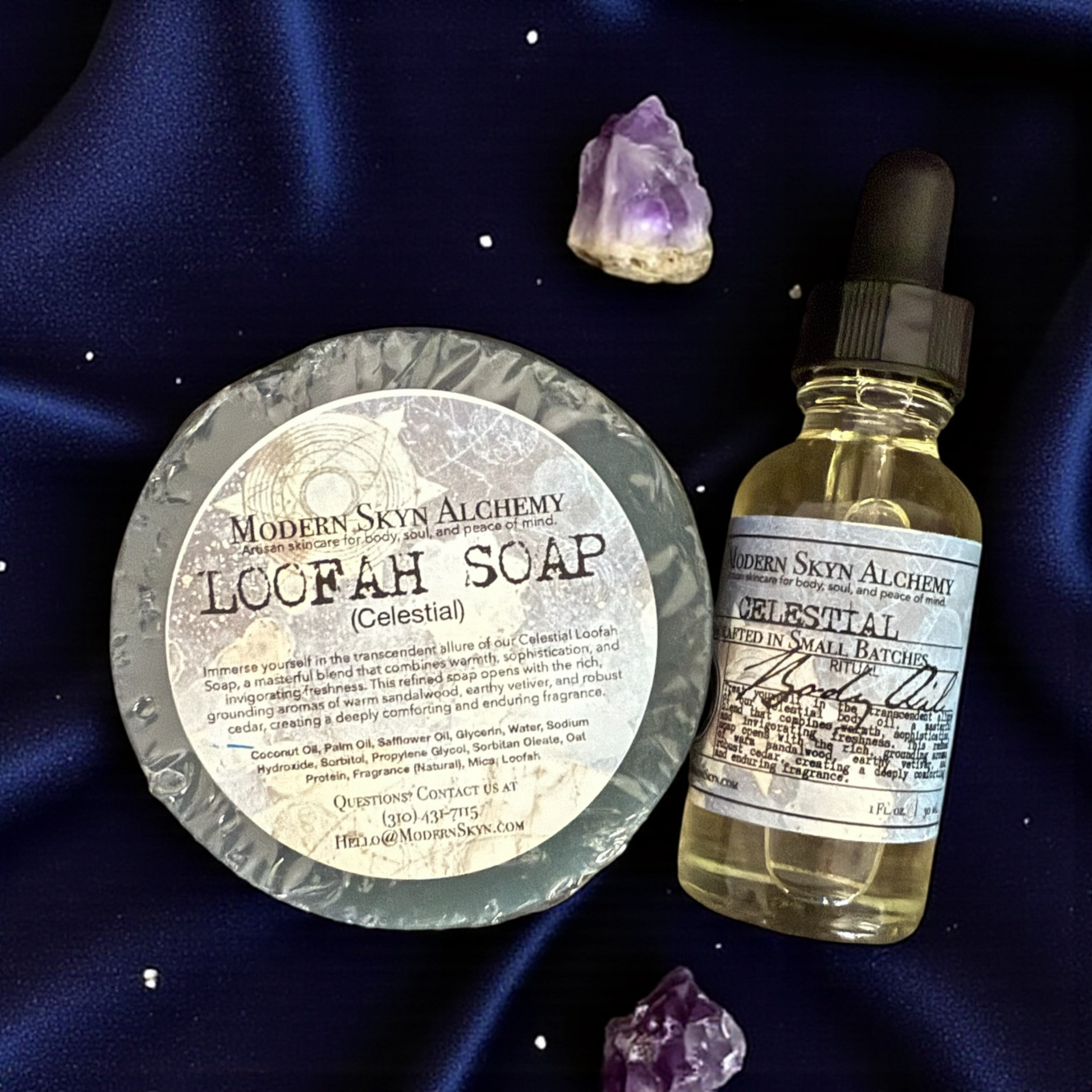 Reach for the stars in your daily ritual with our Celestial Loofah Soap Bar. Handcrafted in small batches, this radiant soap combines a shimmering galaxy-inspired design with a fragrance as dreamy as a midnight sky—soft notes of stardust musk, delicate florals, and a hint of cosmic spice.