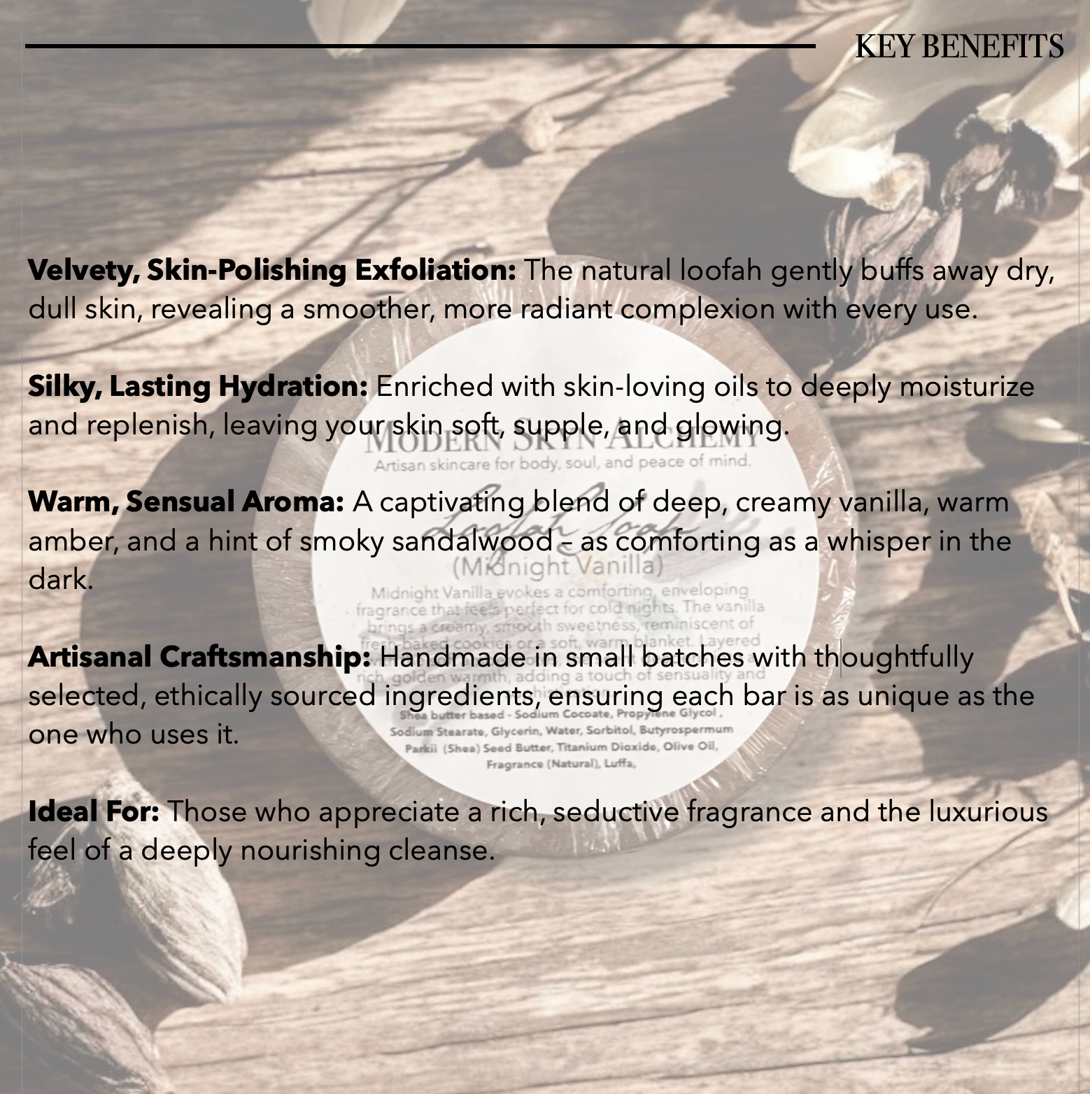 Artisanal Craftsmanship: Handmade in small batches with thoughtfully selected, ethically sourced ingredients, ensuring each bar is as unique as the one who uses it.