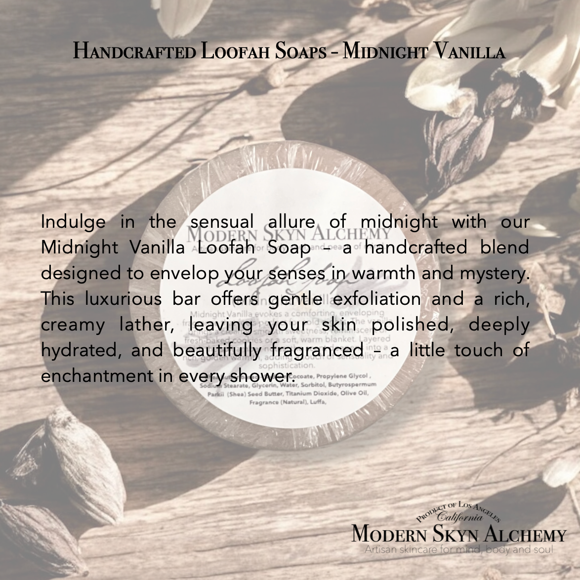 Indulge in the sensual allure of midnight with our Midnight Vanilla Loofah Soap – a handcrafted blend designed to envelop your senses in warmth and mystery. This luxurious bar offers gentle exfoliation and a rich, creamy lather, leaving your skin polished, deeply hydrated, and beautifully fragranced – a little touch of enchantment in every shower.