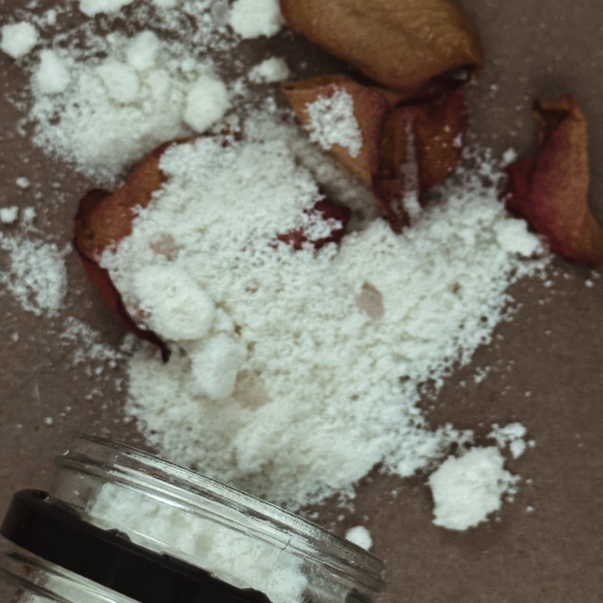 Ingredients: *Powdered Goat Milk, Baking Soda, *Dried Rose Petals, Dried Lavender Buds, *Dried Calendula Flowers, Himalayan Sea Salt; Essential Oils of *Lavender, *Orange Oil