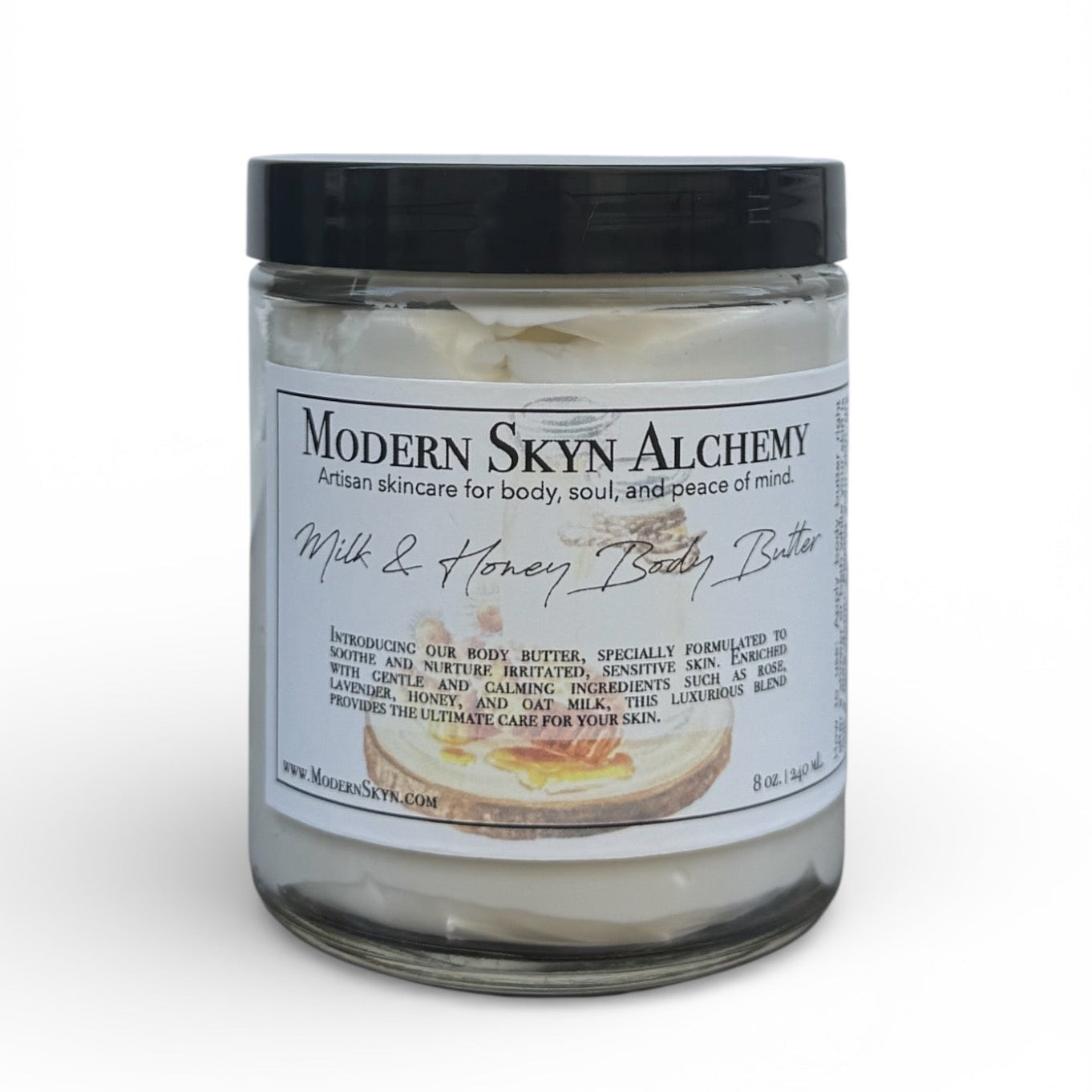 Indulge in the soothing luxury of our Milk & Honey Body Butter and experience the ultimate in skin nourishment and care.